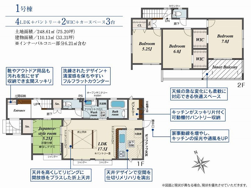4LDK(南向き) 1F:LDK17.5帖 和室5.25帖 洗面・浴室・トイレ |