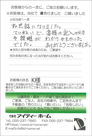 お世話になりました。 ていねいで、書類の記入の仕方や説明がわかりやすかったでした。 ありがとうございました。